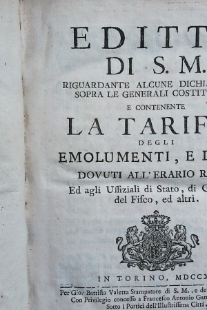La Tariffa degli Emolumenti e dritti dovuti all’erario regio – Torino 1740 r